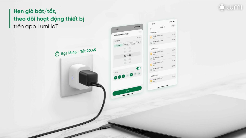 Với tính năng hẹn giờ tự động bật/tắt ngay trên ứng dụng Lumi IoT, ổ cắm Lumi giúp người dùng “nâng cấp” các thiết bị điện thông thường trở nên thông minh với tối đa 10 lịch khác nhau, đáp ứng đa dạng nhu cầu sinh hoạt. Chẳng hạn, bạn có thể lập trình ổ cắm để bật máy bơm nước vào 7:00 – tắt vào 7:30 mỗi sáng, đảm bảo cây cối xanh tốt mà không cần tốn thời gian thao tác thủ công, hoặc đặt lịch bật/tắt khi sạc pin điện thoại (bắt đầu sạc lúc 23:00 và kết thúc lúc 24:00), giúp hạn chế tình trạng chai pin cũng như bảo vệ, tăng tuổi thọ pin.