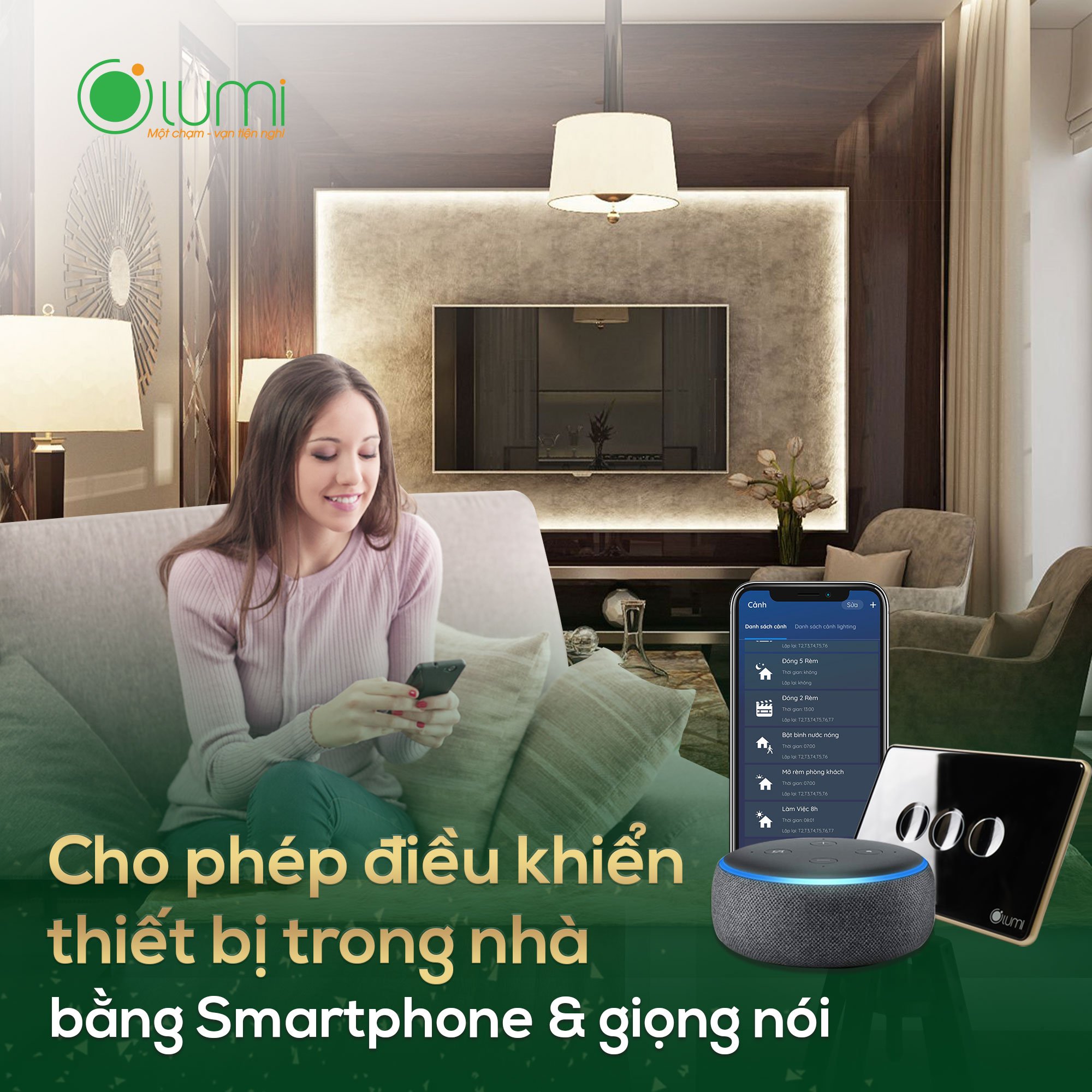 Chỉ cần chạm nhẹ vào công tắc thông minh hoặc thông qua một chiếc Smartphone, qua giọng nói là tất cả những thiết bị đèn điện, bình nóng lạnh, rèm cửa, điều hòa,... sẽ theo hoạt động theo ý muốn của mình. Bạn có thể tạo ra những ngữ cảnh phù hợp với lịch trình sinh hoạt và bối cảnh sinh hoạt trong không gian nhà mình như: xem phim, tiếp khách, đi ngủ,... rất tiện lợi.