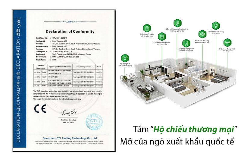- Đã được cấp tấm hộ chiếu thương mại hàng triệu công ty mơ ước - Chứng chỉ tiêu chuẩn Châu Âu CE. Với dấu CE, các sản phẩm của Lumi được ông nhận đáp ứng mọi yêu cầu về mặt pháp lý để tự do lưu thông trong thị trường Châu Âu, mở ra cánh cửa xuất khẩu cho các sản phẩm của Lumi. Singapore là thị trường thứ 8 có sự góp mặt của các sản phẩm của Lumi sau Australia, Ấn Độ, Israel, Lebanon, Lào, Campuchia…